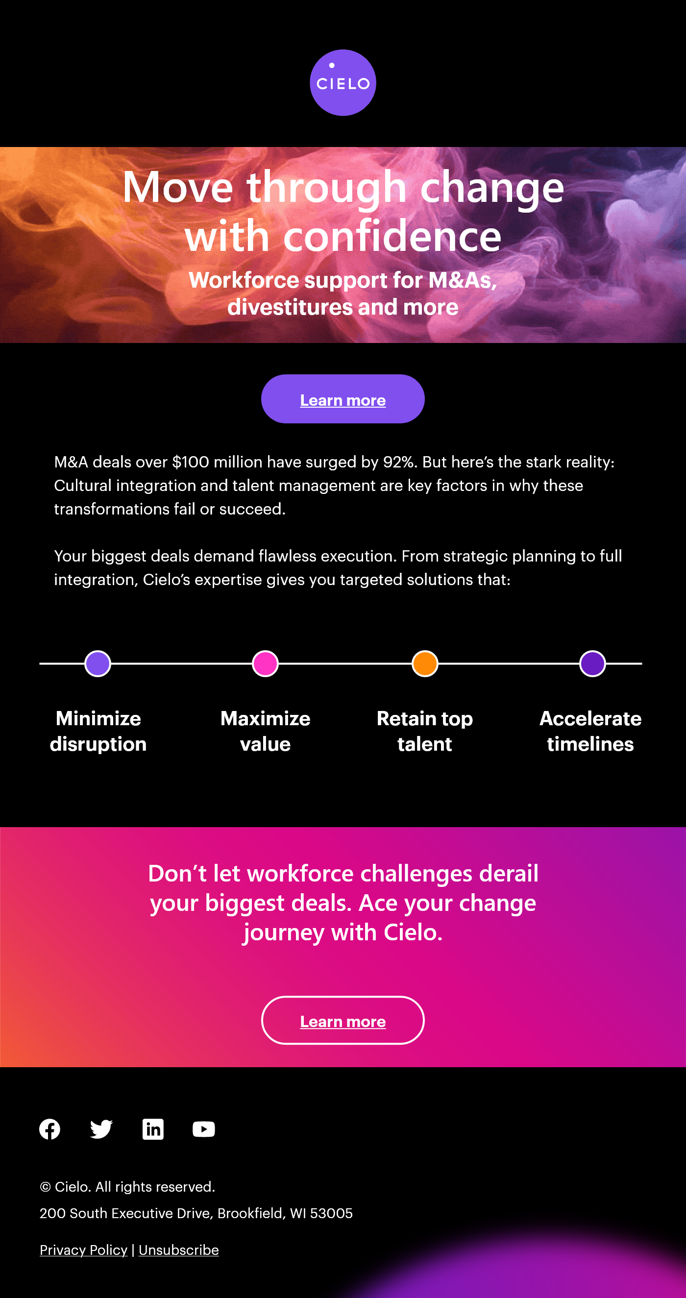For the first of multiple new expertise pages showcasing Cielo’s extended capabilities, the plan included the M&A page itself, organic social media, and an email send.