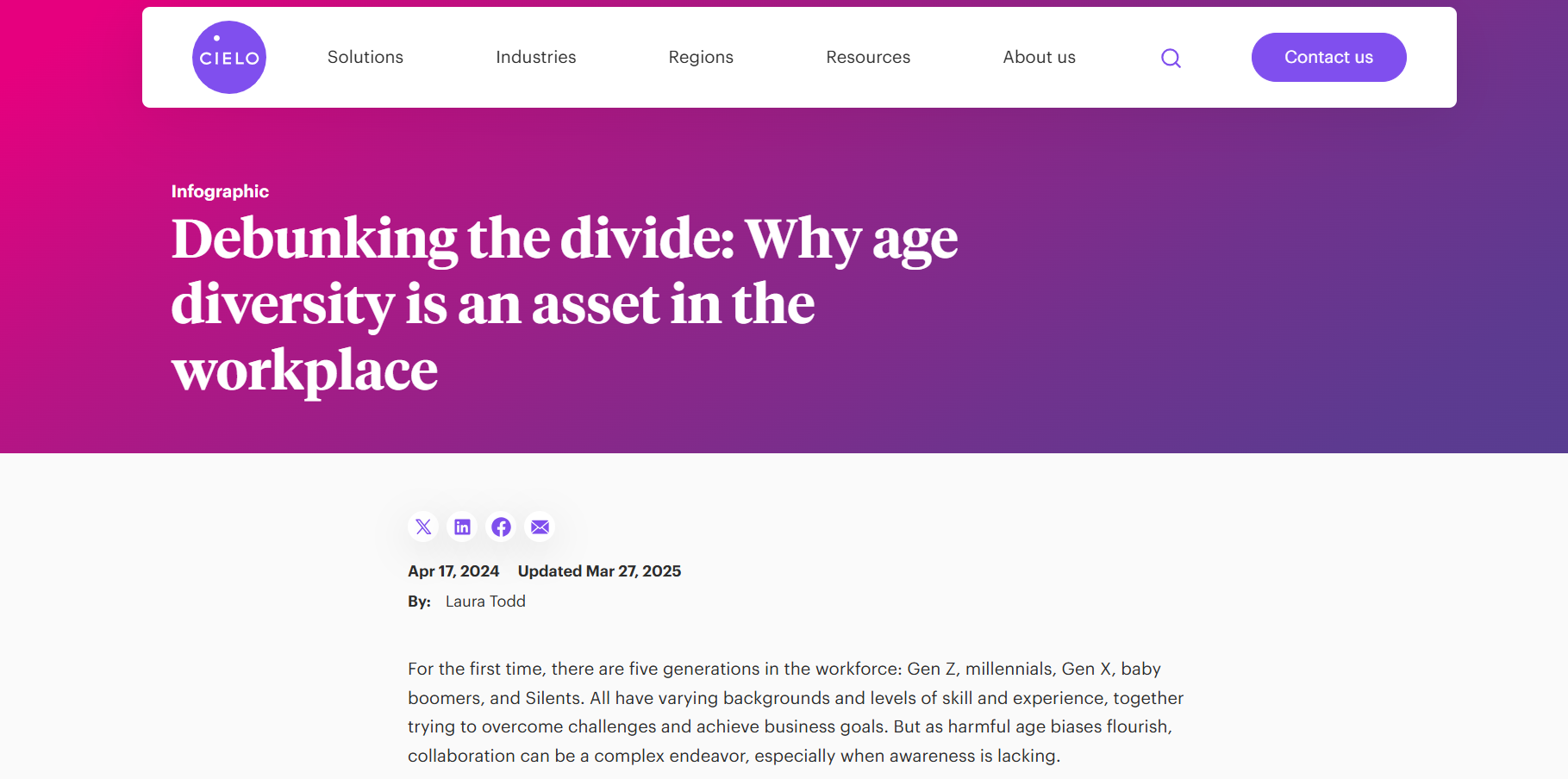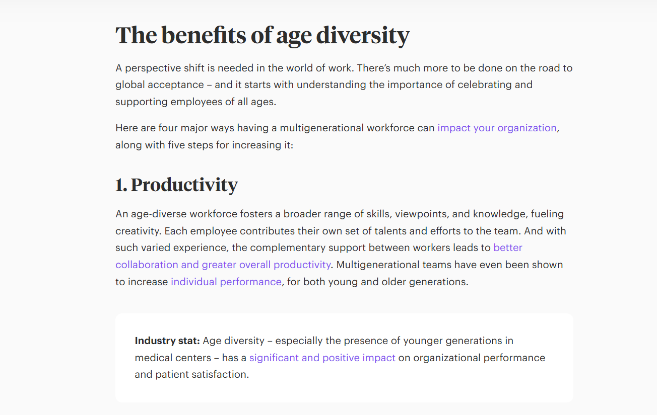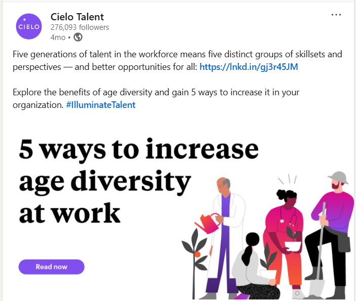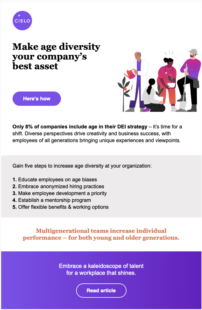 Conduct research and create an article (ghostwritten for senior leadership) on age diversity in the workplace, the benefits of nurturing all five generations, and how leaders can increase it at their organization. This included a dedicated email send and an organic social media post.