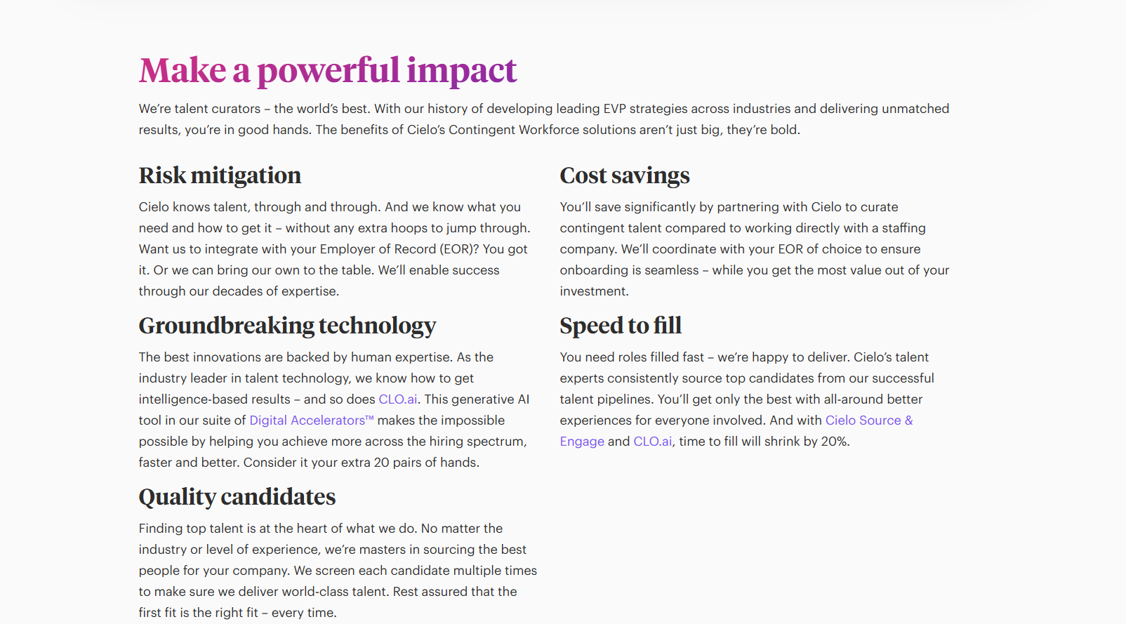 From there, I crafted the page from the ground up, interweaving targeted keywords and creating a clear view of what a contingent workforce is, why organizations benefit, and why Cielo is the right choice for this solution.